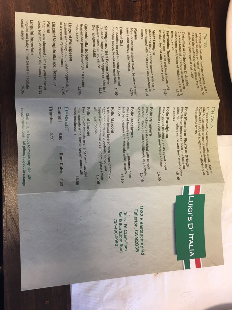 Introducing Luigi's D' Italia, a beloved Italian pizza spot in Fullerton, CA. Specializing in thin, crispy pizza with a robust sauce, they also offer a variety of Italian comfort food such as lasagne bolognese and chicken dishes like Pollo al Limone. Customers rave about the Cannoli and Tiramisu for dessert, praising the rich flavors and quality ingredients. With a cozy atmosphere and friendly service, Luigi's D' Italia is a go-to spot for lunch, dinner, or dessert. Don't miss out on their Fried Calamari and Linguini Principessa, both bursting with flavor and expertly prepared. Whether you're looking for a quick bite or a leisurely meal, Luigi's D' Italia has something for everyone. Don't forget to try their homemade bread and experience a taste of authentic Italian cuisine.