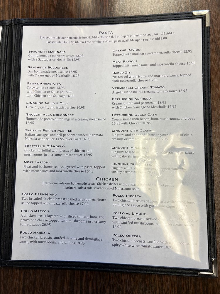 Linguini and chopped clams in your choice of a clear, creamy, or tomato clam sauce. Entrees include our homemade bread. Chicken dishes come over a bed of pasta.