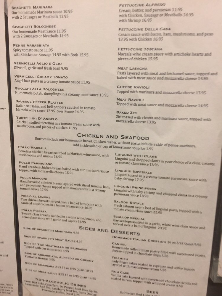Marsala cream sauce with bacon, ham, mushrooms, and peas. Our homemade meat sauce. Entrees include our homemade bread.