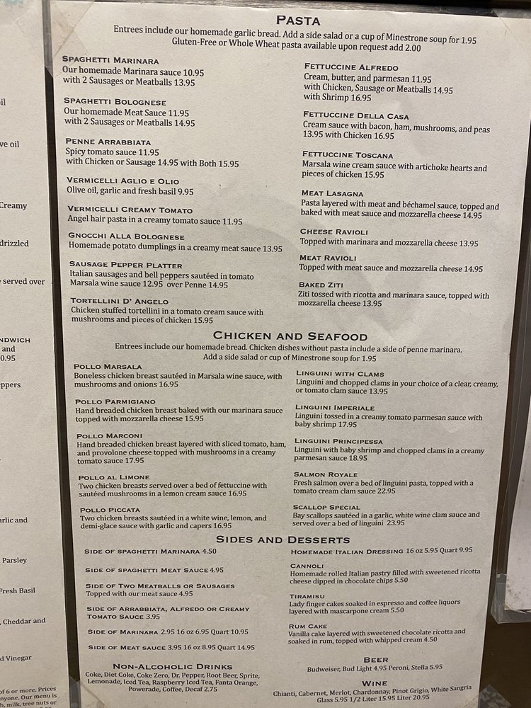 Linguini with baby shrimp and chopped clams in a creamy Parmesan sauce. Entrees include our homemade bread. Chicken dishes come over a bed of pasta.